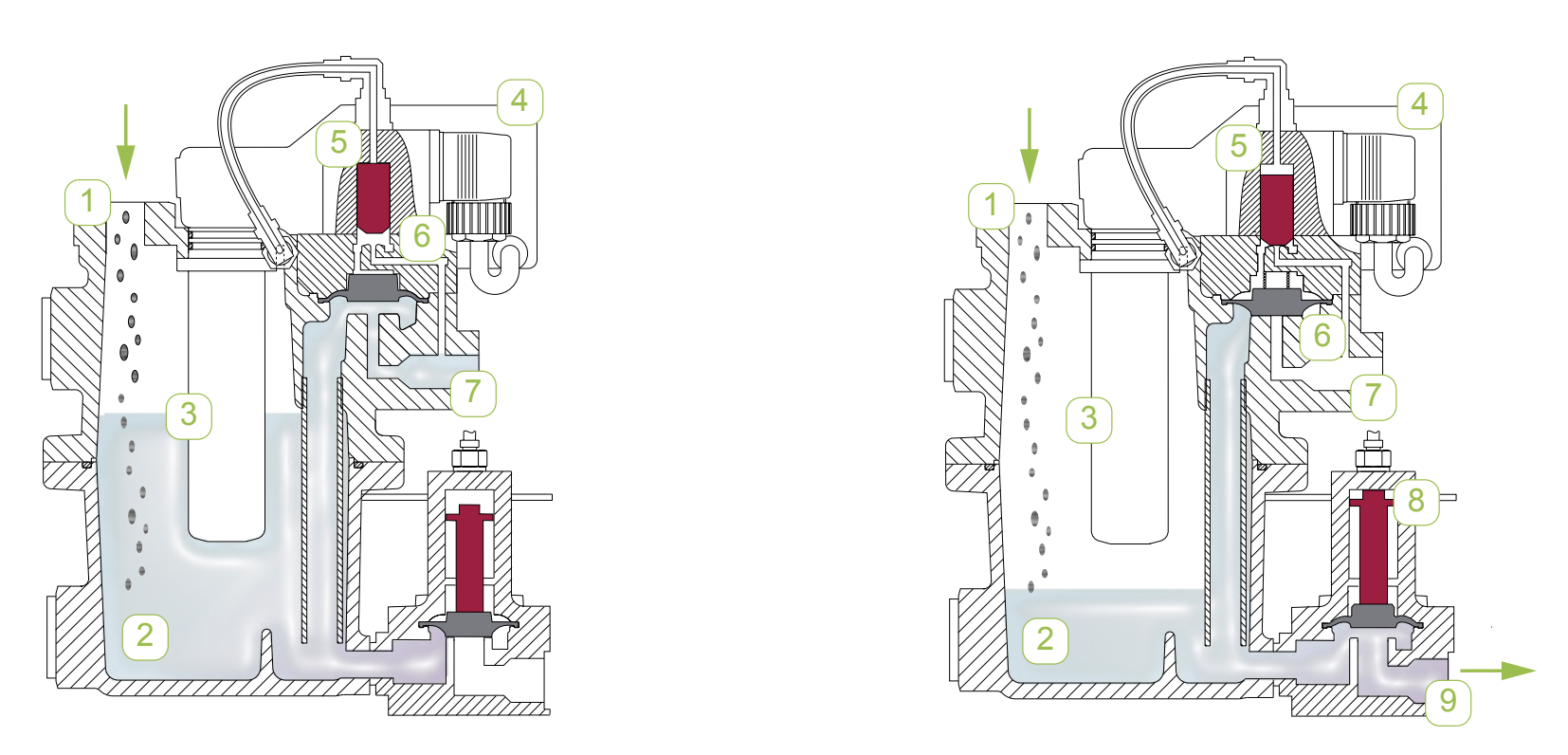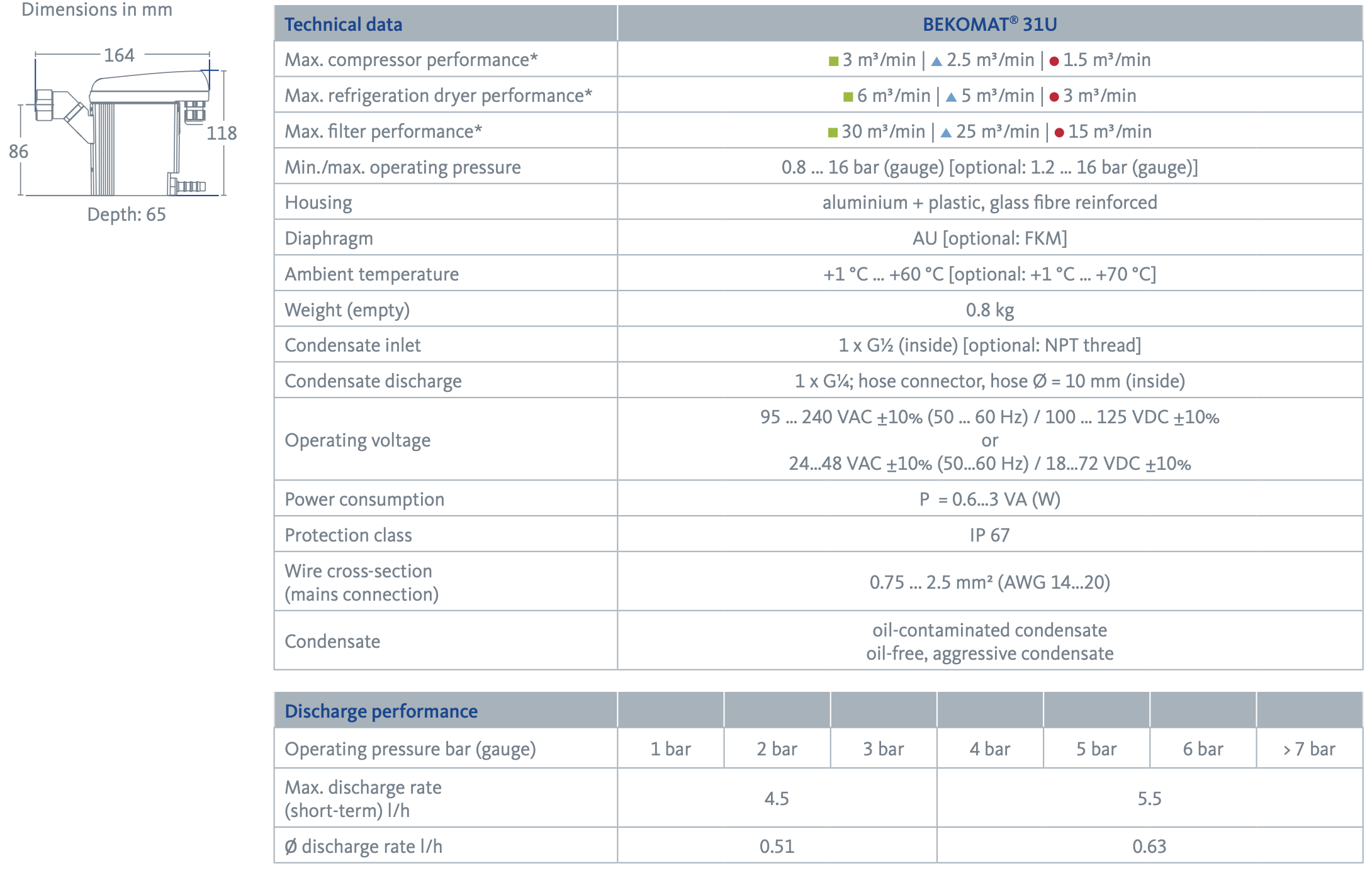 BEKOMAT discharges condensate without compressed air loss, reducing energy costs and CO₂ emissions. This is made possible by its integrated capacitive sensor, intelligent electronics for volume-controlled condensate discharge, and a proven pilot-controlled solenoid valve with a special discharge diaphragm.